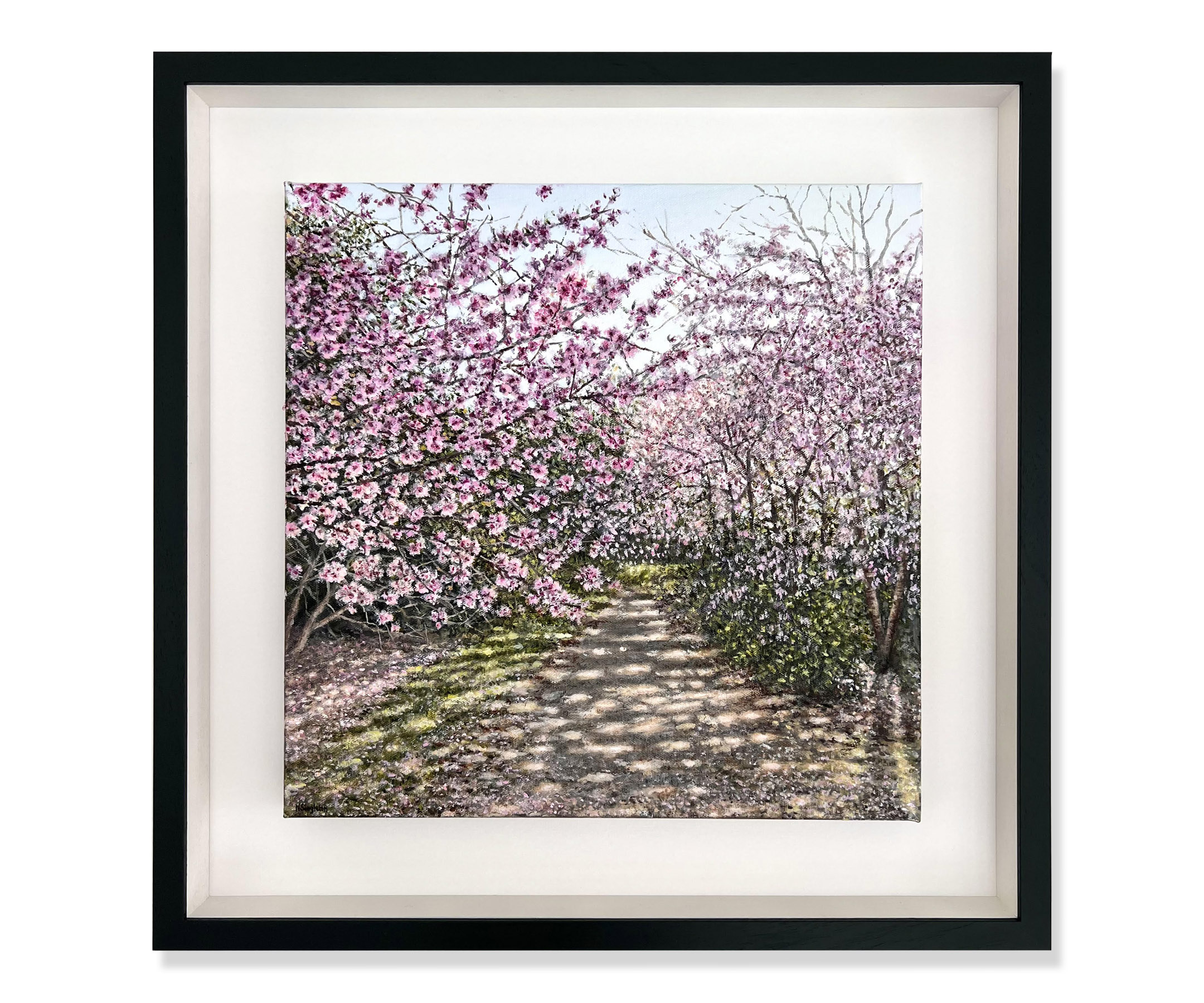 A pathway bathed in dappled light, with sunlight leaking through the blooms of the cherry blossom trees. The flush of pink marking the beginning of Spring – the promise of hope and new beginnings.